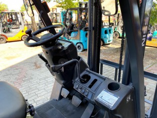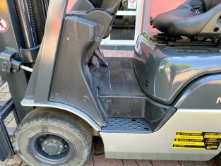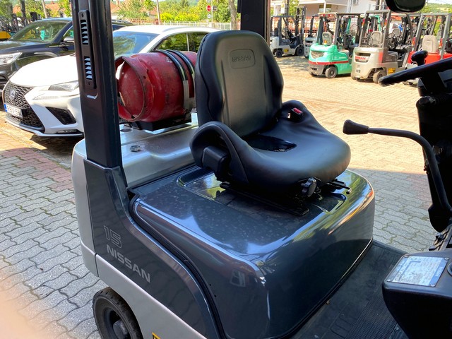 Nissan P1F1A15D típusú használt targonca. Teherbírás 1500kg, emelési magasság 3000mm, gyártási év 2011. Váltó: automata.